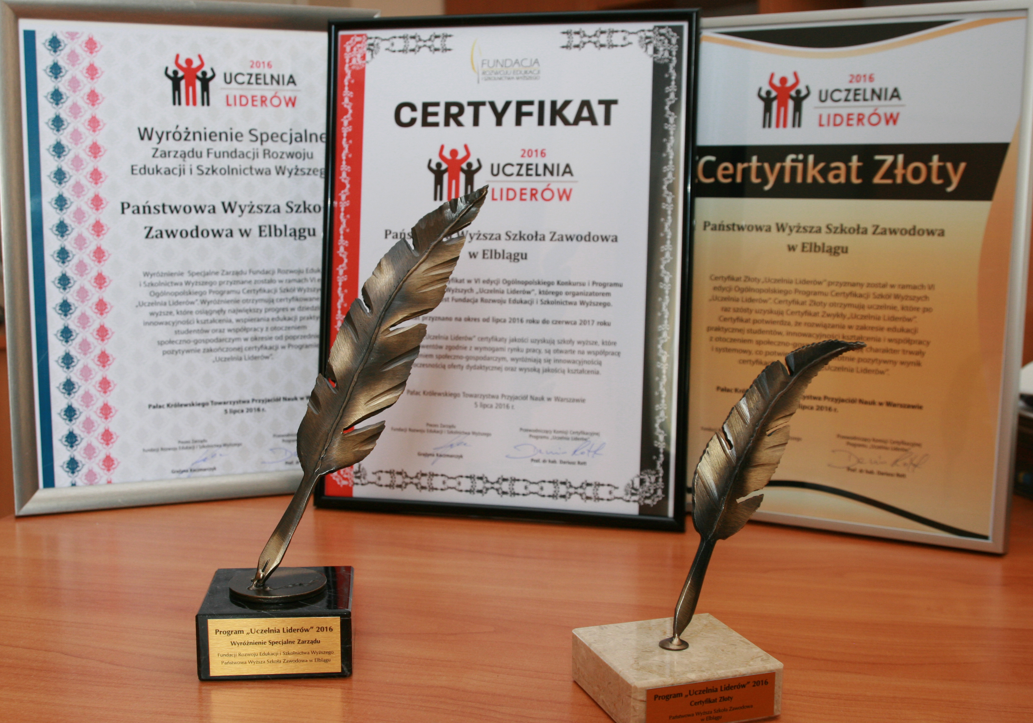 . Elbląskiej PWSZ przyznano Certyfikat Jakości za kształcenie absolwentów zgodnie z wymogami rynku pracy oraz Certyfikat Złoty. To nagroda, przyznawana uczelniom, które wyróżnienie odebrały już po raz szósty. Poza tym PWSZ otrzymała Wyróżnienie Specjalne za osiągnięcie największego postępu w dziedzinie innowacyjności kształcenia i wspierania edukacji praktycznej studentów. Misją programu „Uczelnia Liderów” jest identyfikowanie i promowanie najlepszych polskich uczelni, cechujących się otwartością na potrzeby otoczenia zewnętrznego.